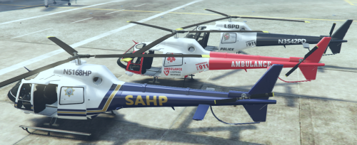 这是我制作的SAHP,LSPD和医疗部门的警用小蛮牛贴图 参考以下两款现实中的CHP和LAPD空中部门并对游戏原版贴图进行了修改优化(还是原来的模型) 正常情况下不会有警员驾驶CHP涂装刷出,可以用修改器随机刷 解压文件并按照以下路径替换 POLMAV替换路径:SteamLibrary\steamapps\common\Grand Theft Auto V\(mods)\update\x64\dlcpacks\patchday3ng\dlc.rpf\x64\levels\gta5\vehicles.rpf 如果你拥有Ultimate Backup,请再替换下面的路径 SpecialUnits.xml替换路径:SteamLibrary\steamapps\common\Grand Theft Auto V\Plugins\LSPDFR\UltimateBackup 替换上面的文件后将为你增加一个州际空中单位可以用于Code3响应和追捕 如图所示(支持1.8.5.6外置汉化版,其他版本我没有测试) 模型转换作者:https://www.gta5-mods.com/vehicles/air-port-service-and-service-vehicles-template-pack 如果遇到有关贴图的问题或者有建议欢迎给我反馈 -